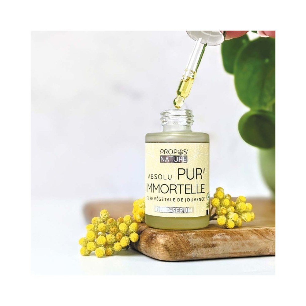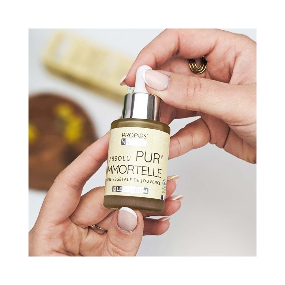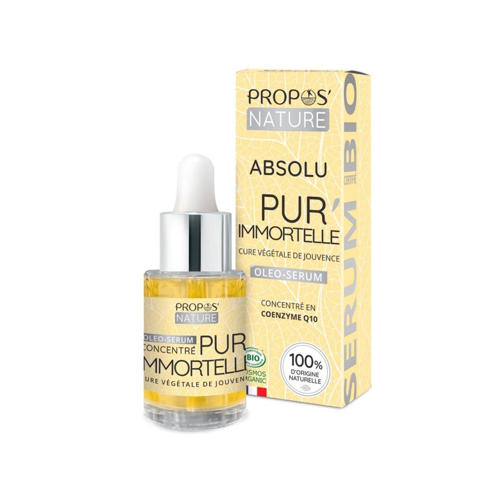 Olejowe serum Anti-Aging Pur’Immortelle BIO to skoncentrowana, codzienna pielęgnacja przeciwzmarszczkowa na noc. Dzięki unikalnemu połączeniu oleju (maceratu) i olejku eterycznego z kocanki włoskiej (nieśmiertelnika), serum efektywnie spowalnia procesy starzenia się skóry, silnie regeneruje i przywraca jędrność. Jest to serum BIO na zmarszczki z certyfikatem COSMOS ORGANIC.