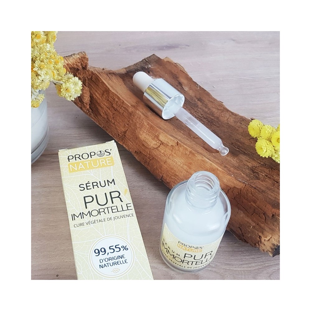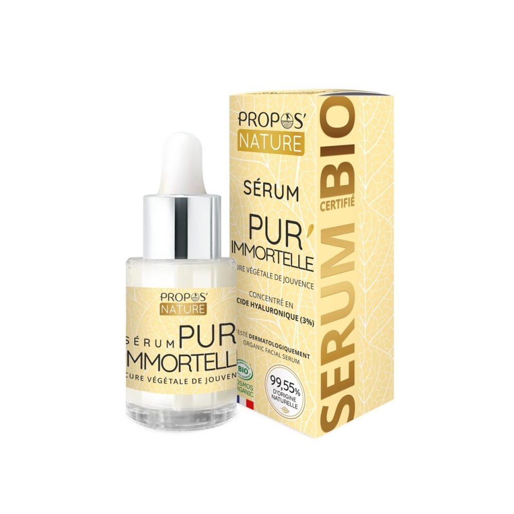 Organiczne serum Pur’Immortelle BIO firmy Propos’Nature to skoncentrowana kuracja anti-aging, która łączy w sobie wyjątkowe stężenie 3% kwasu hialuronowego. To sekret intensywnego nawilżenia i widocznego efektu "wypełnienia" skóry. Formuła wykorzystuje dwa różne typy kwasu hialuronowego, które działają w synergii z hydrolatem z kocanki włoskiej (nieśmiertelnika), aby wspierać produkcję kolagenu i redukować oznaki starzenia.