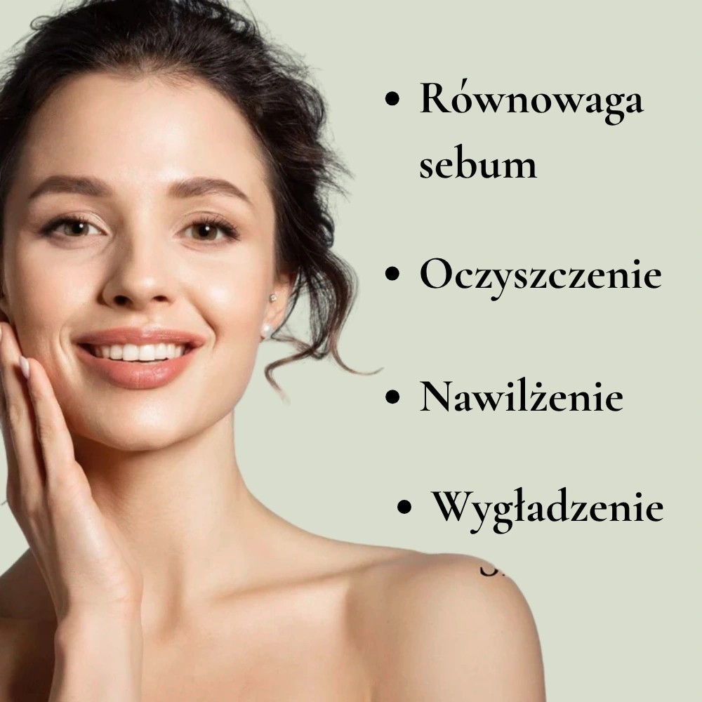 - Skóra: oczyszczenie porów, redukcja błyszczenia, wygładzenie tekstury, mniejsze zaczerwienienia i dyskomfort.